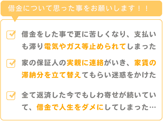 全ての借金が払い終わった今でも借金時代のしわ寄せが終わる事なく続いていて、借金のせいで人生をダメにしてしまったと言わざるを得ません。