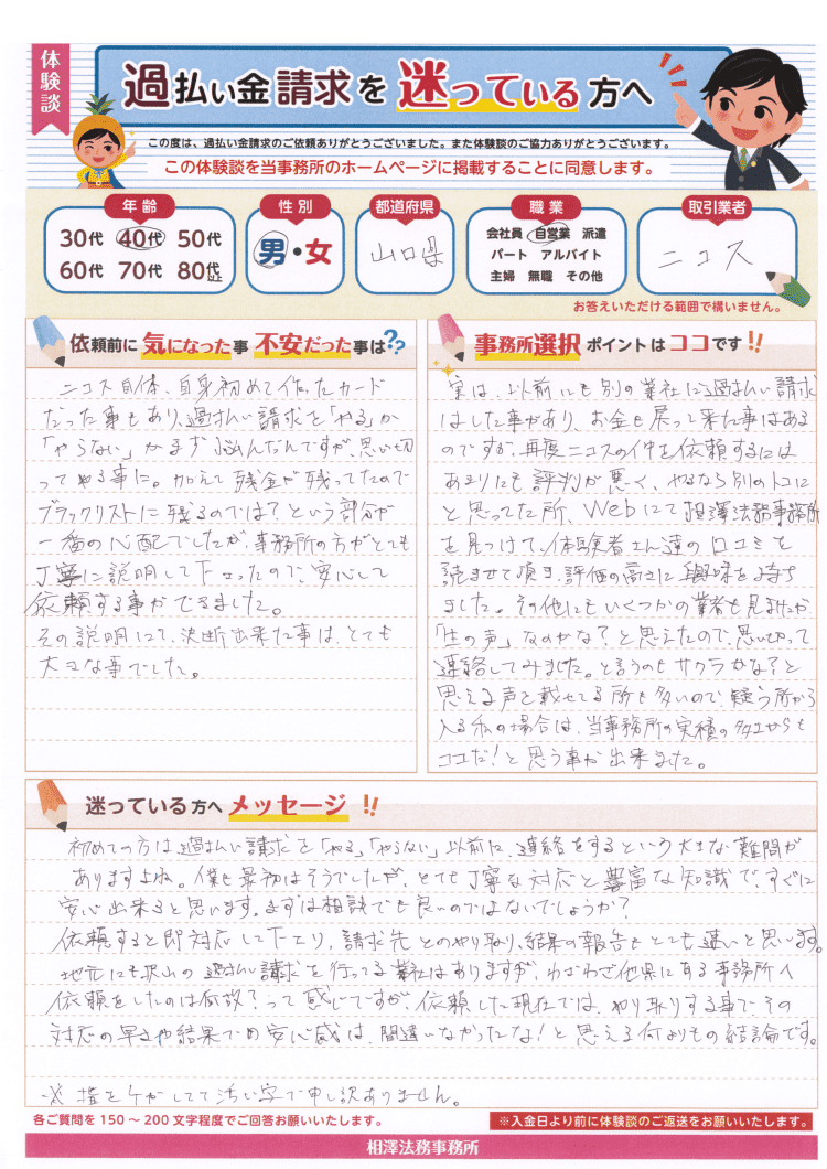 実は、以前にも別の業者に過払い請求はした事があり、お金も戻って来た事はあるのですが、再度ニコスの件を依頼するにはあまりにも評判が悪く、やるなら別のトコにと思ってた所、Webにて相澤法務事務所を見つけて、体験者さん達の口コミを読ませて頂き、評価の高さに興味を持ちました。