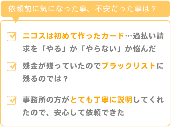 加えて残金が残ってたのでブラックリストに残るのでは?という部分が一番の心配でしたが、事務所の方がとても丁寧に説明して下さったので、安心して依頼する事ができました。