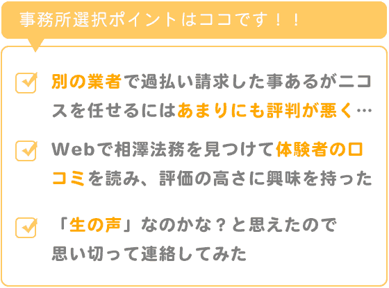 と言うのもサクラかな?と思える声を載せてる所も多いので、疑う所から入る私の場合は、当事務所の実績の多さからもココだ!と思う事が出来ました。