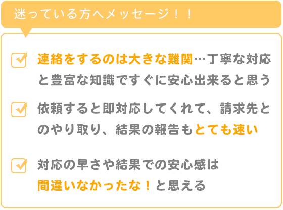 依頼すると即対応して下さり、請求先とのやり取り、結果の報告もとても速いと思います。