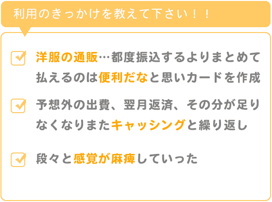 お付き合いなど急な出費がありキャッシングを利用、予想外の出費、翌月返済すれば結局その分が足りなくなりまたキャッシングと繰り返すようになり段々と感覚が麻痺していったんだと思います。