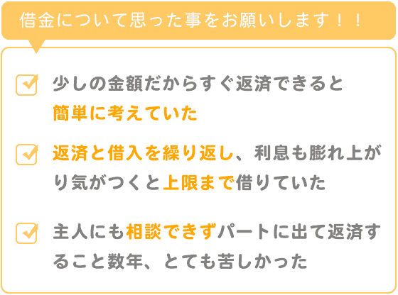 ちょっと足りないから、少額だからと甘い考えで借り、主人にも相談できずパートに出て返済すること数年とても苦しかったです。