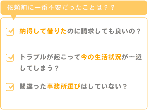 過払い金請求を依頼した時、自分が納得して借りたお金で苦しい時に助けられたのに請求しても良いのだろうか、請求した後に何か自分自身にトラブルが起こり今の生活状況が一辺してしまうのではないだろうか、事務所に依頼してきちんと対応してくれる事務所を選ばないといけないので間違った事務所選びはしていないだろうか、この3点が一番不安に思い毎日毎日ネット検索をして後悔しないようにと考えていました。