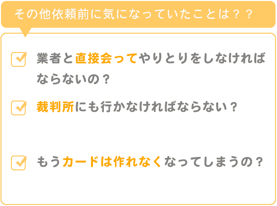裁判所にも行かなければならないのか、もうローンのカードは作れなくなってしまうのだろうか、依頼してから何年もかかってしまうのだろうか等々たくさん気になることがあり不安に思い諦めてしまおうかとも思いました。