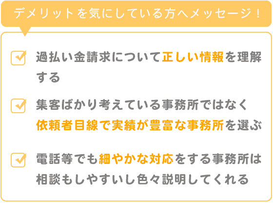 ネット上では間違った情報が出回っていますので過払い金請求について正しい情報を理解し集客ばかり考えている事務所ではなく依頼者目線で実績が豊富な事務所を選んで1日も早く判断して相談をしてみて下さい。