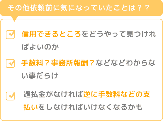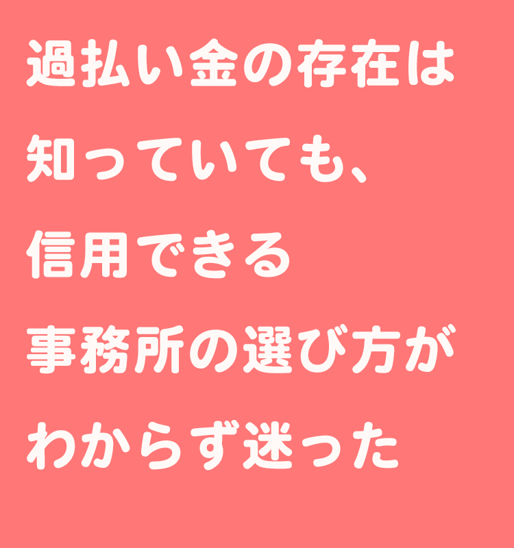 過払金というものがあるというのは、知りましたが、よくわからないところに依頼してしまわないか不安でした。