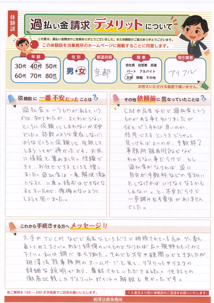 それでも不安や疑問はでてきましたが相澤法務事務所のホームページを見て、デメリットやリスクの詳細な説明があり、電話させていただきました。