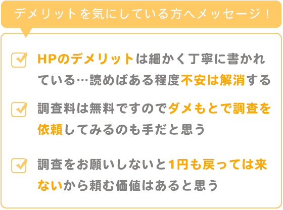 まあ調査料は無料ですのでダメもとで調査を依頼してみるのも手ですね。頼んだあとは焦らずに気長に待っているだけです。