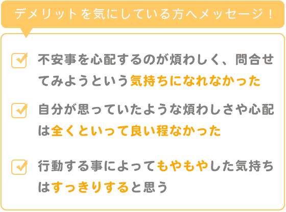 しかし、ふとしたきっかけで問い合わせてみれば、自分が思っていたようなわずらわしさや心配は全くといって良い程ありませんでした。