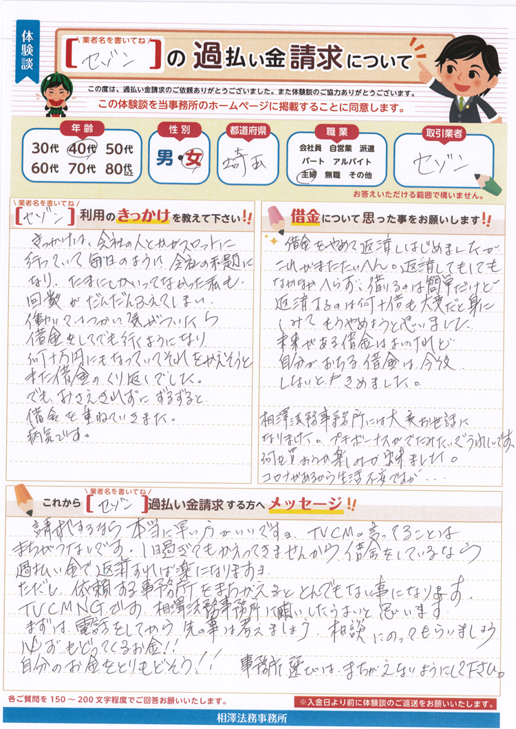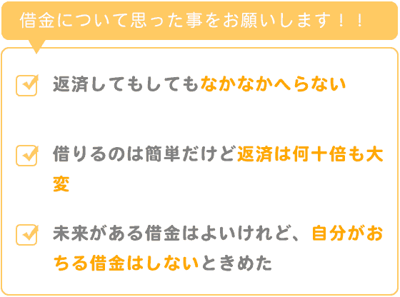 返済してもしてもなかなかへらず、借りるのは簡単だけど返済するのは何十倍も大変だと身にしみてもうやめようと思いました。