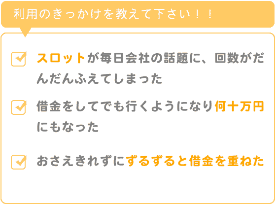 きっかけは、会社の人とかがスロットに行っていて毎日のように会社の話題になり、たまにしか入ってなかった私も、回数がだんだんふえてしまい、働いてはつかい気がついたら借金をしてでも行くようになり何十万円にもなっていてそれをかえそうとまた借金のくり返しでした。