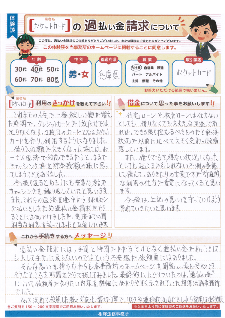 また、これらの返済を途中からリボルビング払いとしたため過払い金請求ができることには気づけましたが、完済までの間相当な利息を払ってしまったと反省しています。
