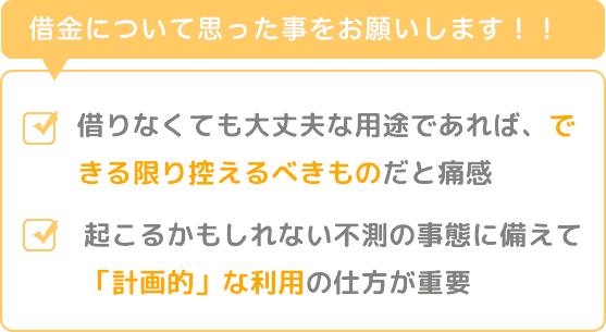 また、借りざるを得ない状況になったとしても起こるかもしれない不測の事態に備えて、ありきたりの言葉ですが「計画的」な利用の仕方が重要になってくると思います。