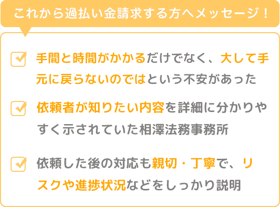 過払い金請求には、手間と時間がかかるだけでなく、過払い金があったとしても大して手元に戻らないのではという不安感が依頼前にはありました。