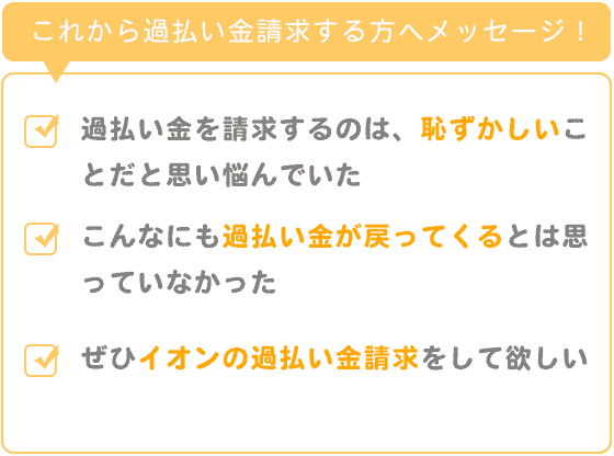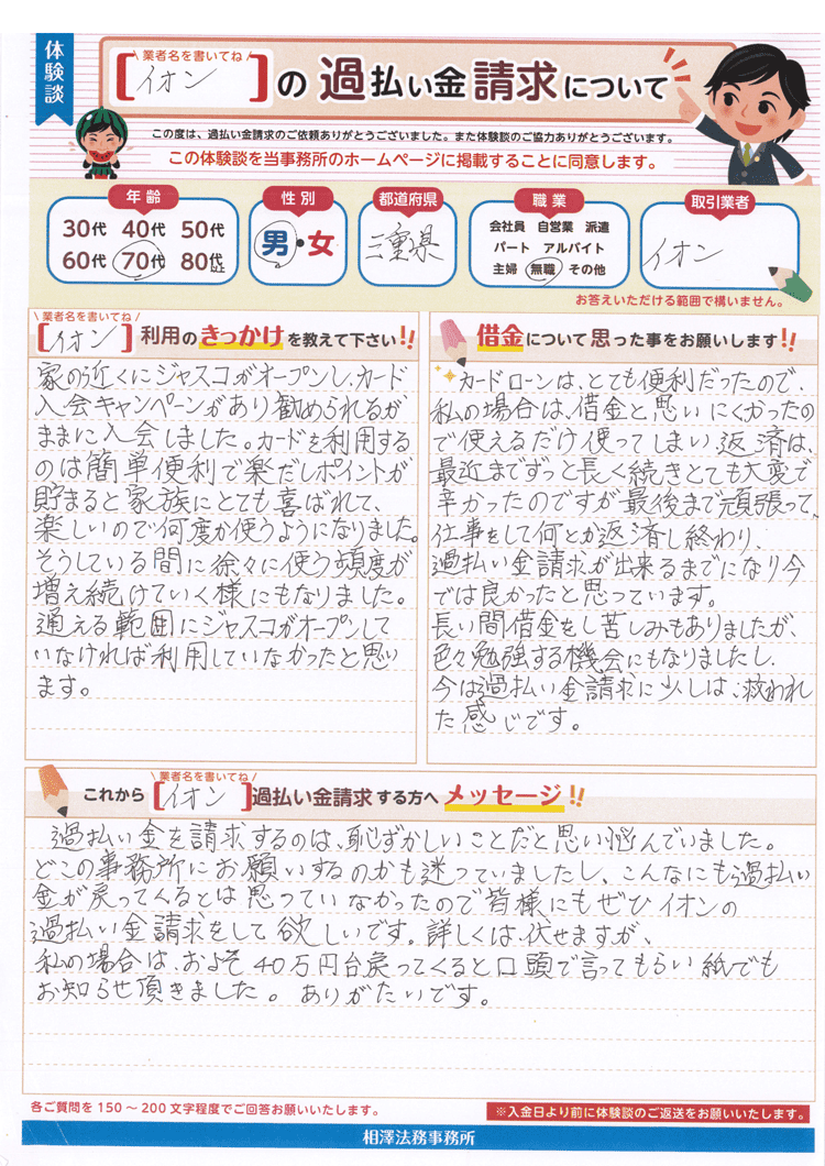 どこの事務所にお願いするのかも迷っていましたし、こんなにも過払い金が戻ってくるとは思っていなかったので皆様にもぜひイオンの過払い金請求をして欲しいです。