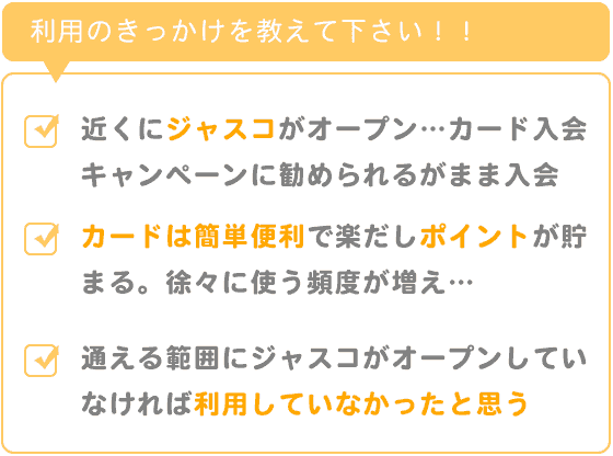 家の近くにジャスコがオープンし、カード入会キャンペーンがあり勧められるがままに入会しました。