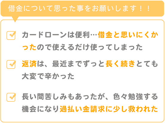 長い間借金をし苦しみもありましたが、色々勉強する機会にもなりましたし、今は過払い金請求に少しは、救われた感じです。