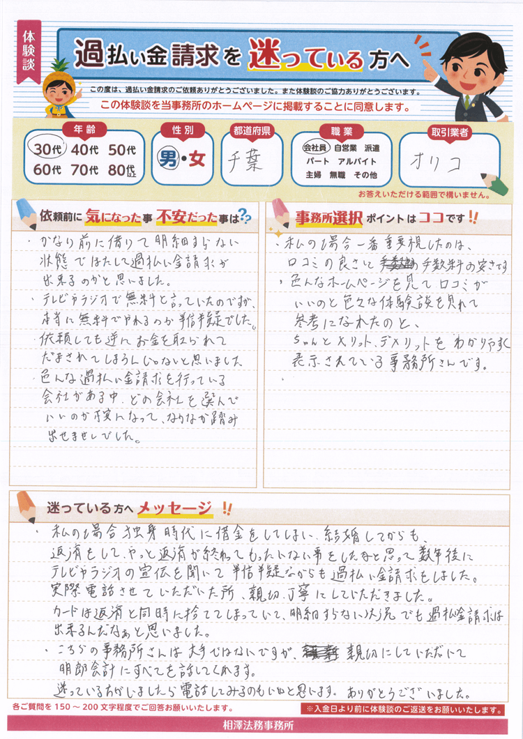 総額160万円の過払い金回収。相澤法務事務所を選んでよかった!
