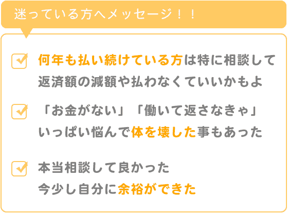 でも少しでも負担を軽減して、気持ちも体も元気な方がよくないですか?心も体も元気じゃないとお金も返せないし稼げない!