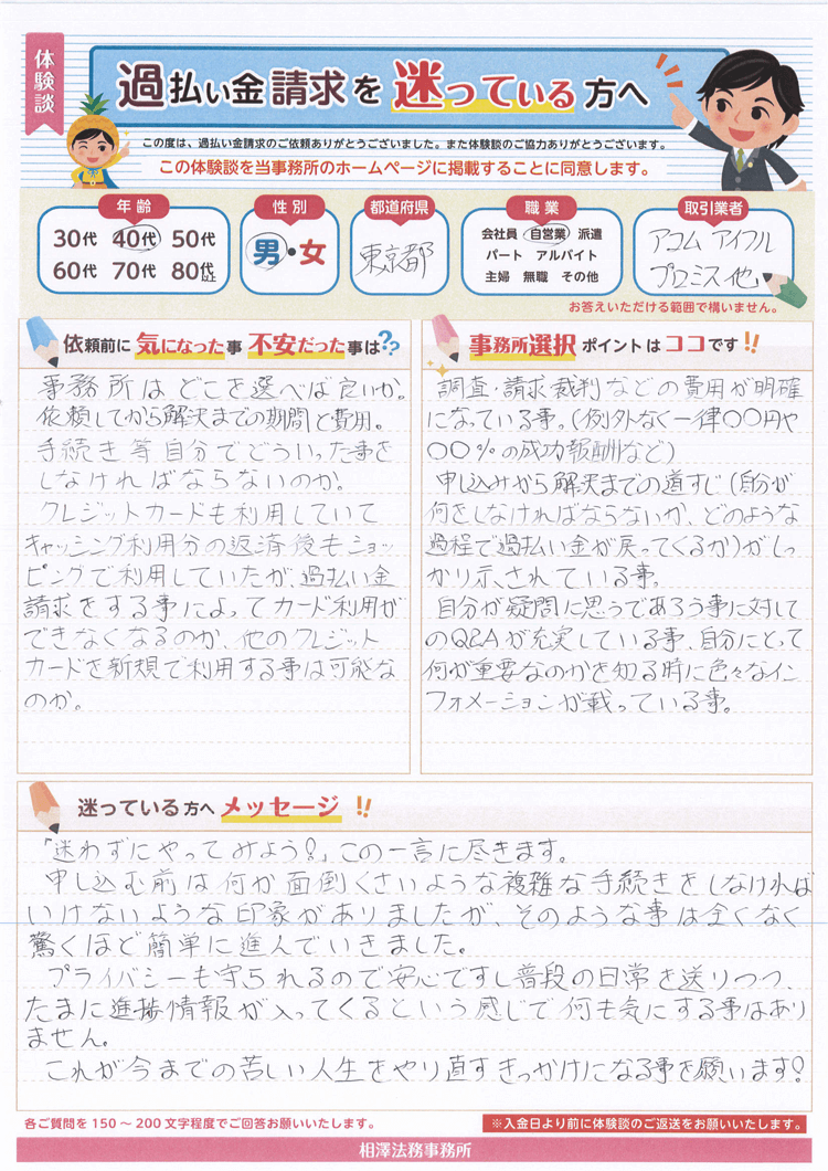 (例外なく一律〇〇円や〇〇%の成功報酬など)申し込みから解決までの道すじ(自分が何をしなければならないか、どのような過程で過払い金が戻ってくるか)がしっかり示されている事。