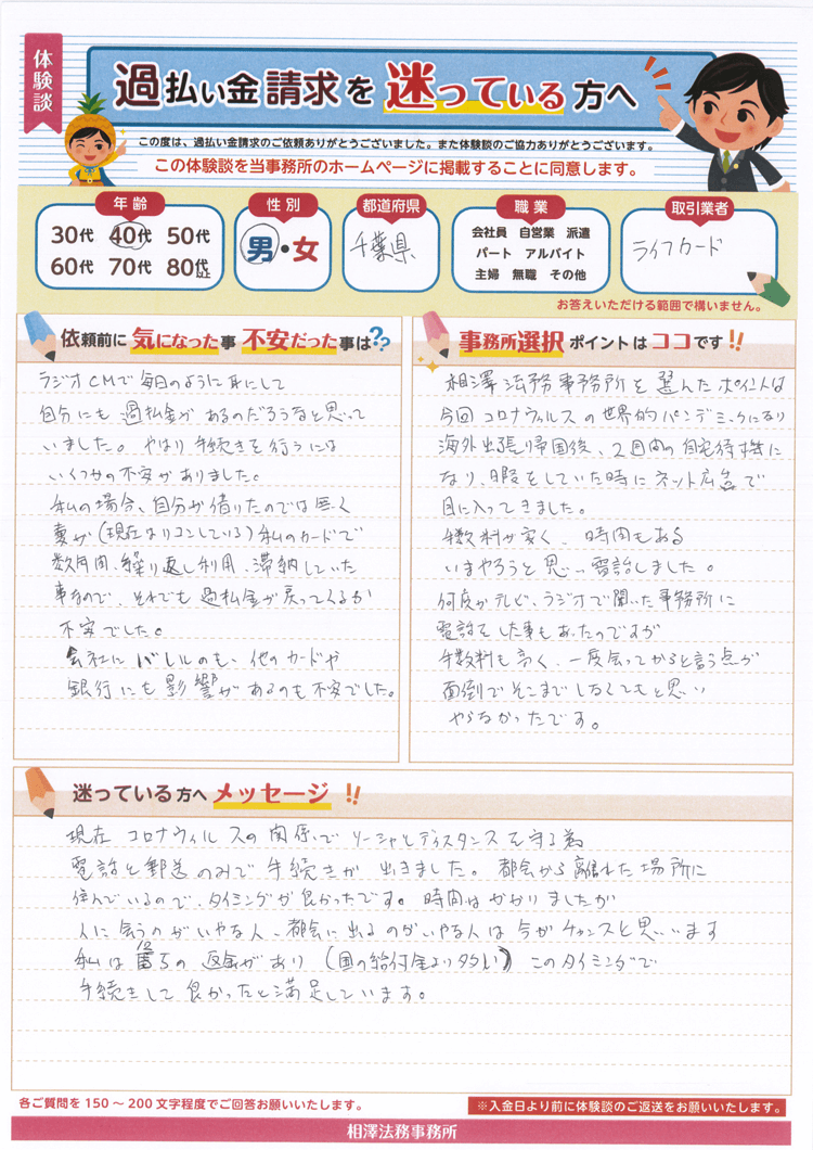 私の場合、自分が借りたのでは無く妻が(現在はリコンしている)私のカードで数年間、繰り返し利用、滞納していた事なので、それでも過払金が戻ってくるか不安でした。