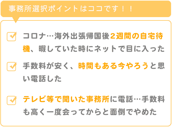相澤法務事務所を選んたポイントは今回コロナウィルスの世界的パンデミックになり海外出張帰国後、2週間の自宅待機になり、暇をしていた時にネット広告で目に入ってきました。