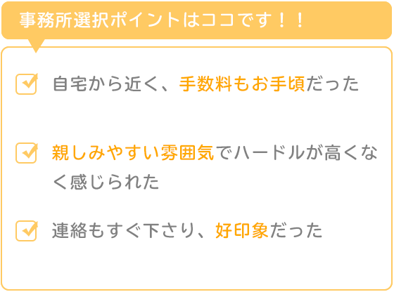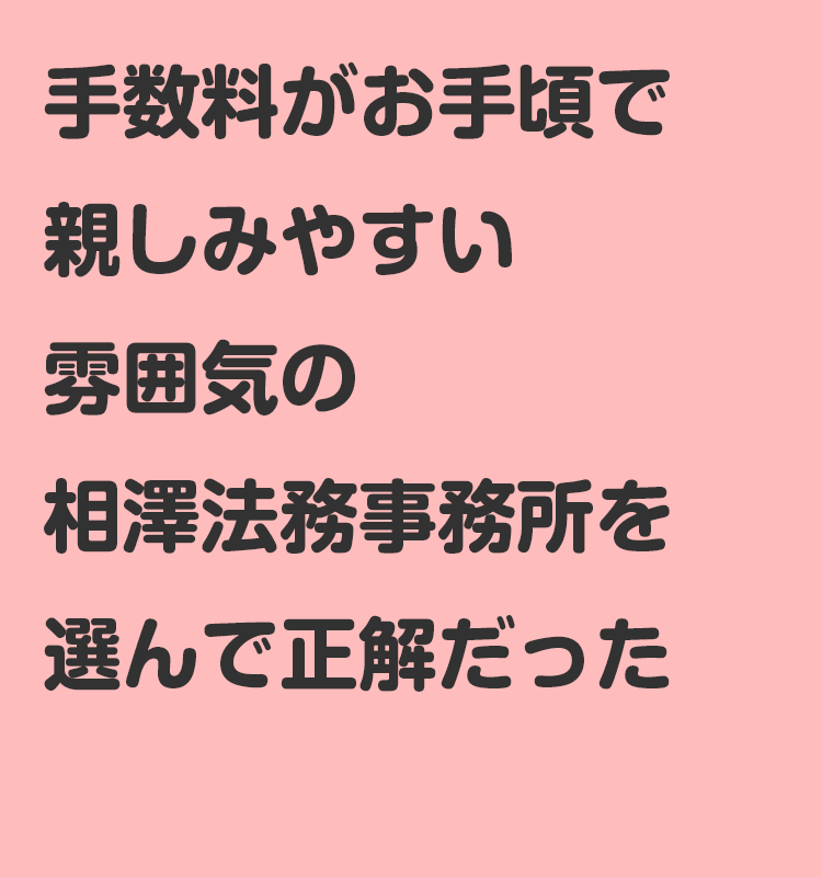 おすすめだという事もふまえて検討しましたが、相澤法務事務所さんを選んで良かったと感じます。