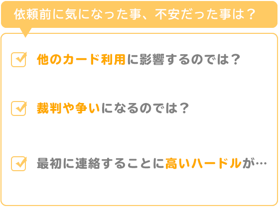 他のカード利用に影響するのでは?裁判や争いになるのでは?等々ですがそもそも事務所に最初に連絡することに高いハードルがあって、その理由付けにしていたように思います。