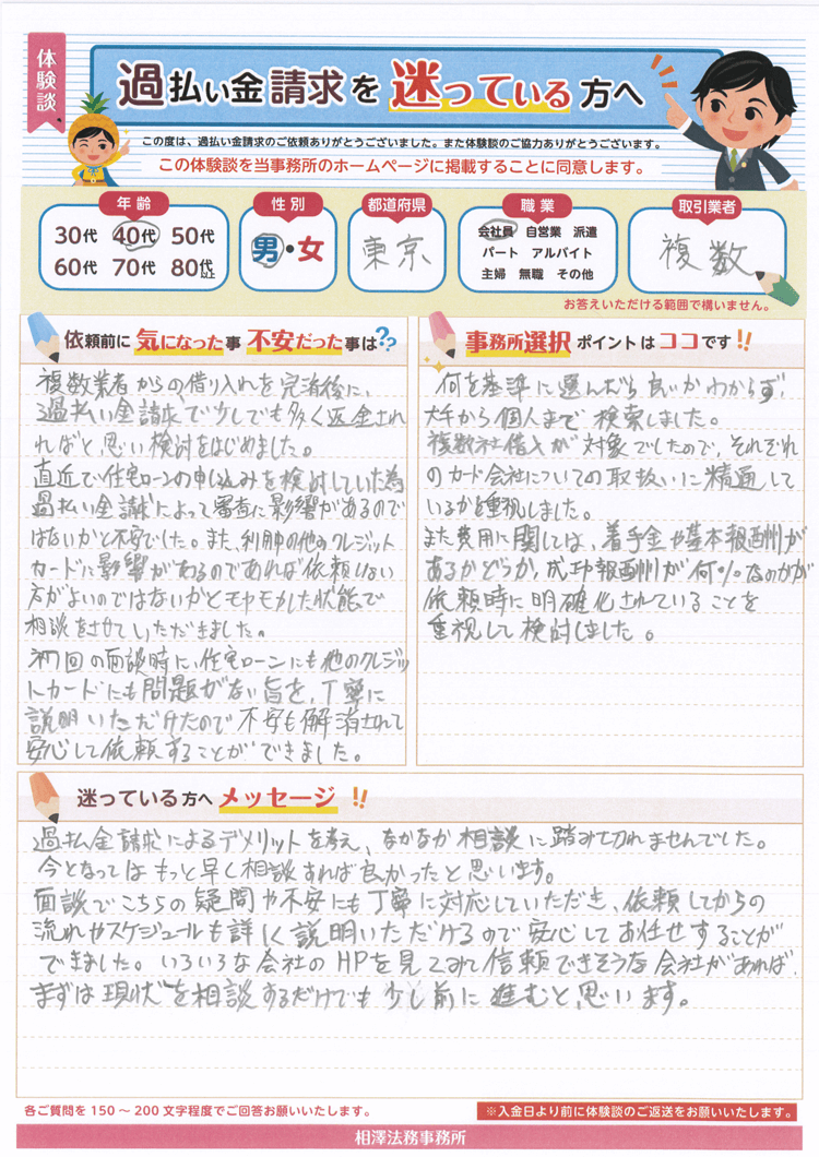 複数業者からの借り入れを完済後に、過払い金請求で少しでも多く返金されればと思い検討をはじめました。