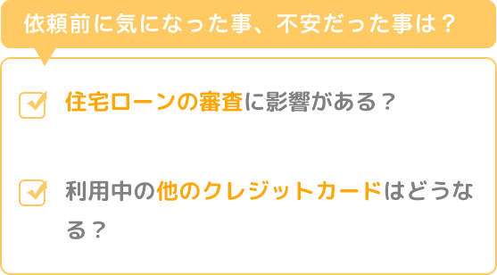また、利用中の他のクレジットカードに影響があるのであれば依頼しない方がよいのではないかとモヤモヤした状態で相談をさせていただきました。