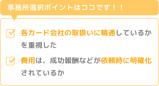 複数社借入が対象でしたので、それぞれのカード会社についての取扱いに精通しているかを重視しました。