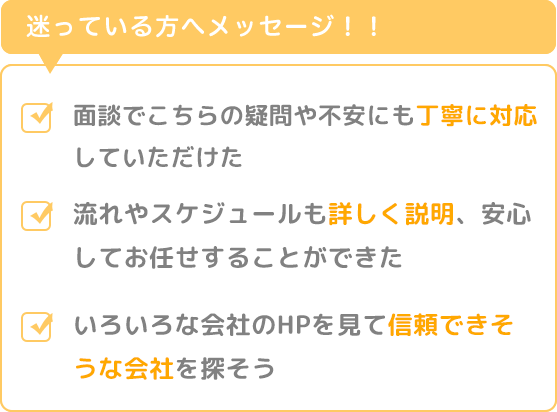 面談でこちらの疑問や不安にも丁寧に対応していただき、依頼してからの流れやスケジュールも詳しく説明いただけるので安心してお任せすることができました。