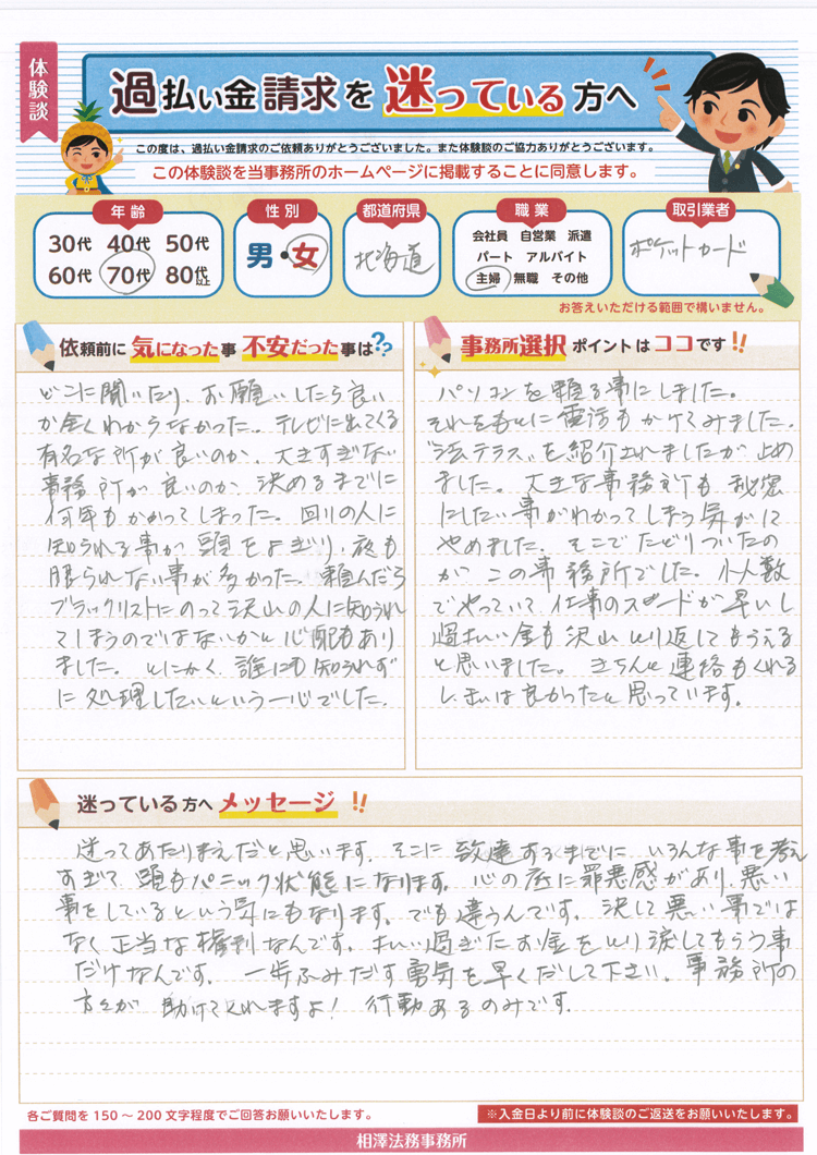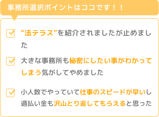そこでたどりついたのがこの事務所でした。小人数でやっていて仕事のスピードが早いし過払い金も沢山とり返してもらえると思いました。