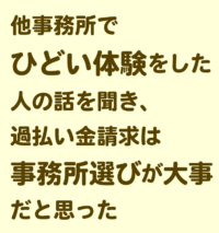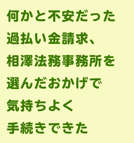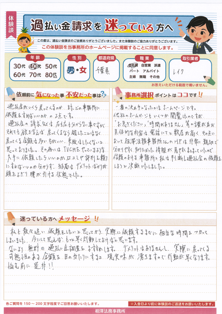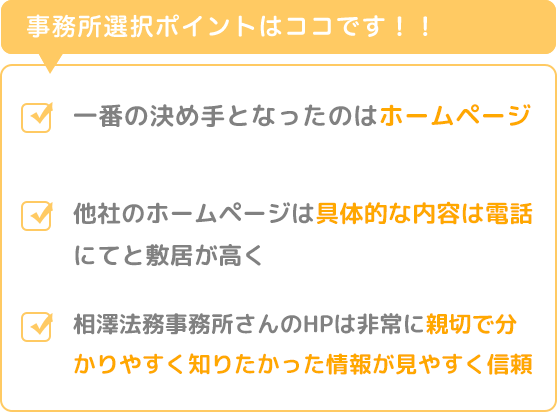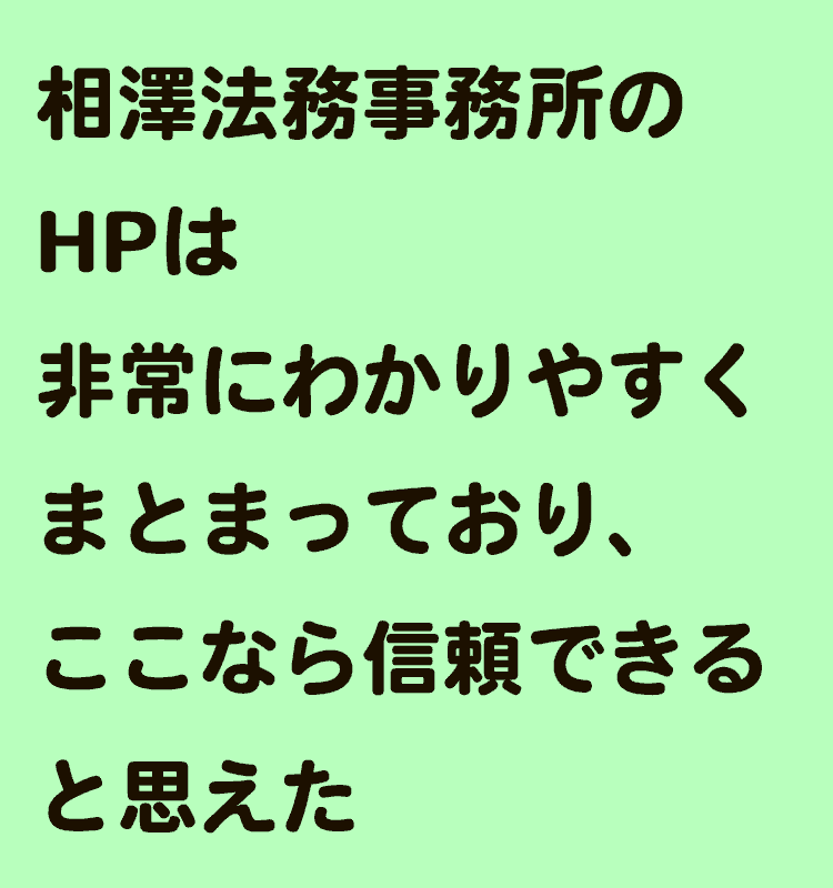 他社のホームページもいくつか閲覧したのですが「お急ぎください」「時間がありません」等の言葉が並び具体的な内容は電話にてと敷居が高くその点において相澤法務事務所さんのHPは非常に親切で分かりやすく知りたかった情報が見やすくまとまっていたので信頼のおける事務所と私は判断し過払金の依頼をしようと決断いたしました。