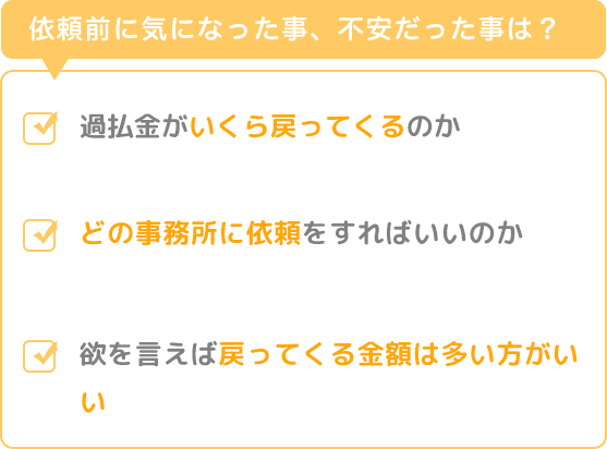 過払金がいくら戻ってくるのかまたどの事務所に依頼をすればいいのかの2点です。