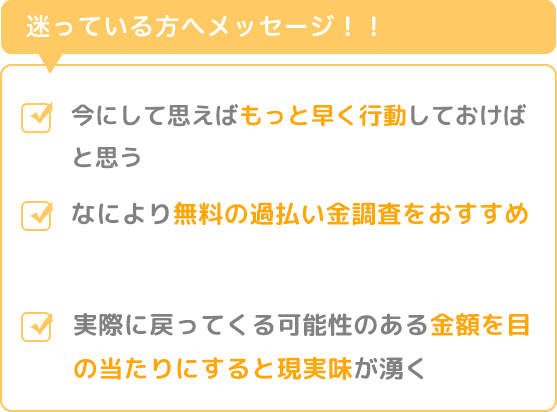 今にして思えばもっと早く行動しておけばと思います。なにより無料の過払い金調査をおすすめします。