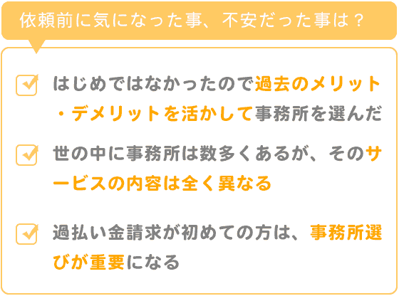 過払い金請求に対しての不安はなくても、実は逆に言えば、はじめではなかったので過去のメリット・デメリットを活かして事務所を選びました。