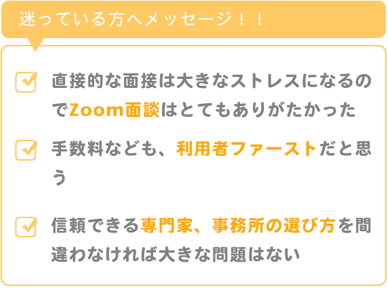 この体験談では、事務所の宣伝は禁じられておりますので詳しくはご説明できませんが、個人的にはコロナ禍の影響で、面談はzoomでの実施だったのでその面につきましては事務所に訪問する必要もなく、とても助かりました。