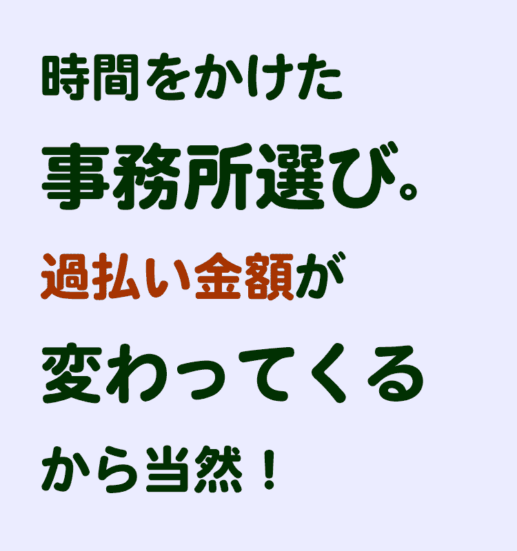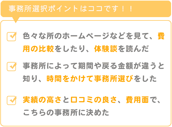依頼する事務所によって、期間や手元に入ってくる金額が違うと知り、時間をかけて事務所選びをしました。