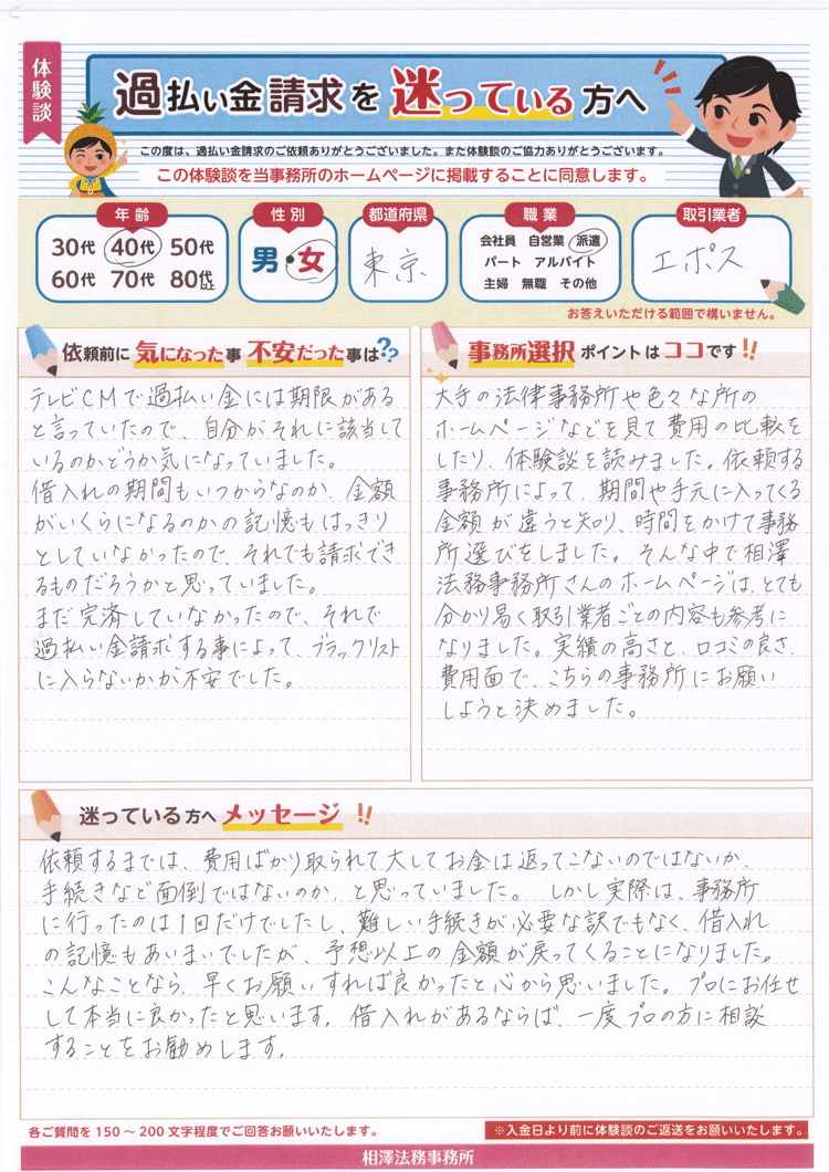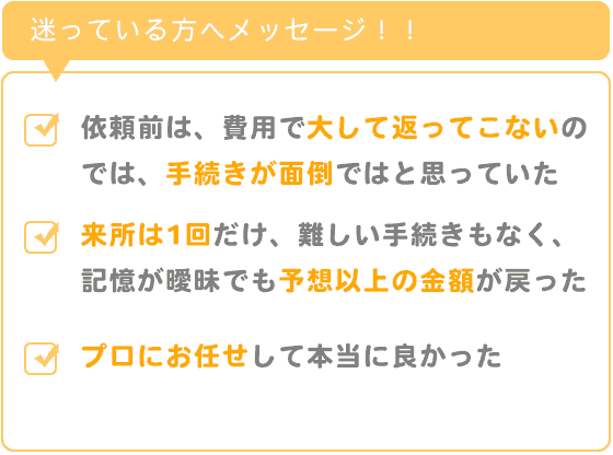 依頼するまでは、費用ばかり取られて大してお金は返ってこないのではないか、手続きなど面倒ではないのか、と思っていました。