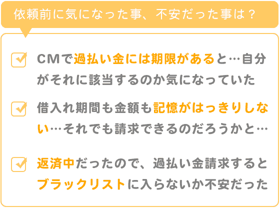 まだ完済していなかったので、それで過払い金請求する事によって、ブラックリストに入らないかが不安でした。