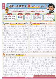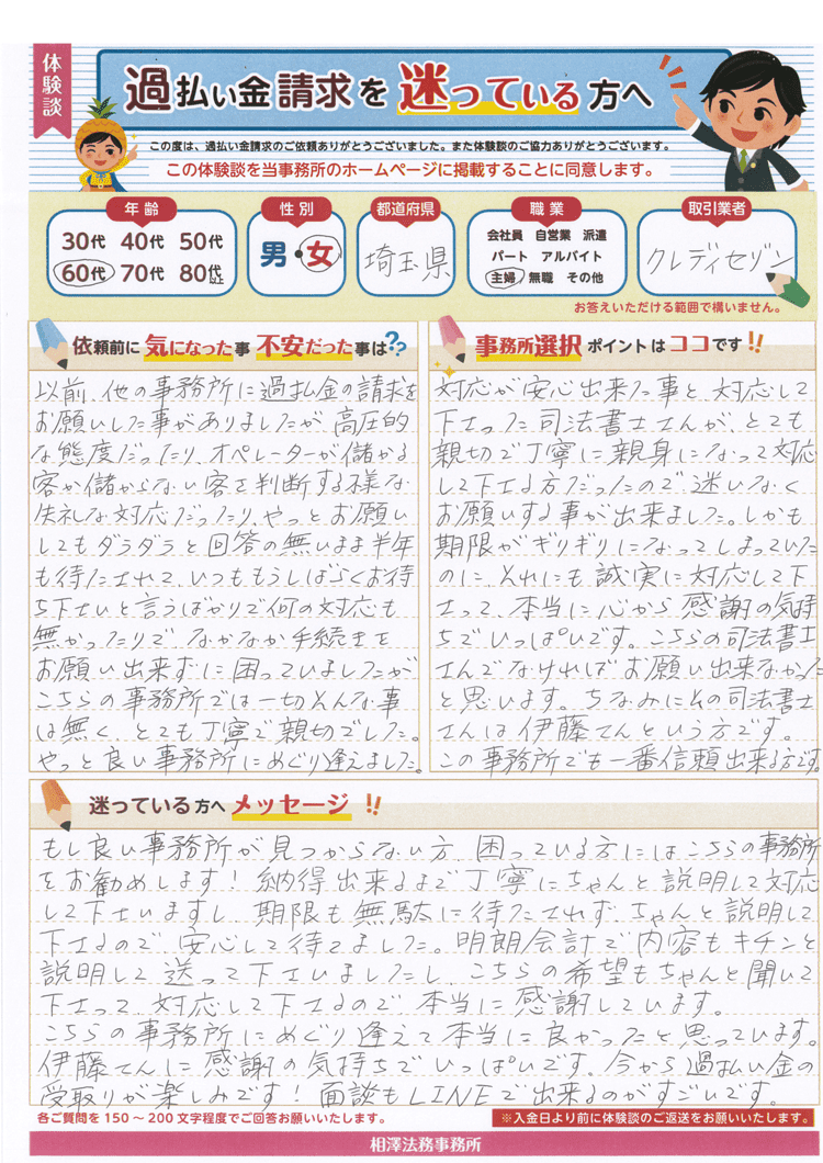 以前、他の事務所に過払金の請求をお願いした事がありましたが高圧的な態度だったり、オペレーターが儲かる客か儲からない客を判断する様な失礼な対応だったり、やっとお願いしてもダラダラと回答の無いまま半年も待たされて、いつももうしばらくお待ち下さいと言うばかりで何の対応も無かったりで、なかなか手続きをお願い出来ずに困っていましたがこちらの事務所では一切そんな事は無く、とても丁寧で親切でした。やっと良い事務所にめぐり逢えました。