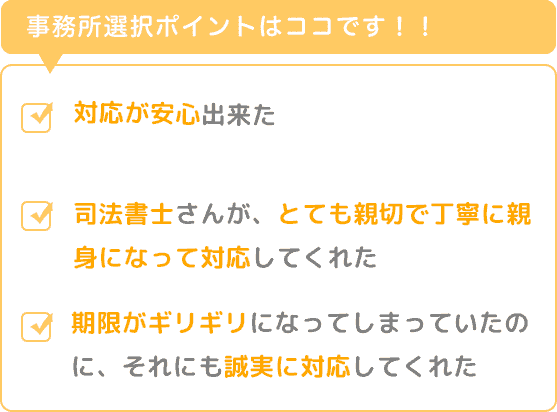 対応が安心出来た事と、対応して下さった司法書士さんが、とても親切で丁寧に親身になって対応して下さる方だったので、迷いなくお願いする事が出来ました。