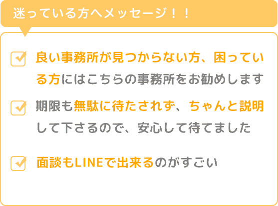 もし良い事務所が見つからない方、困っている方にはこちらの事務所をお勧めします!