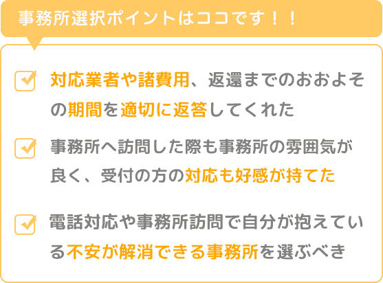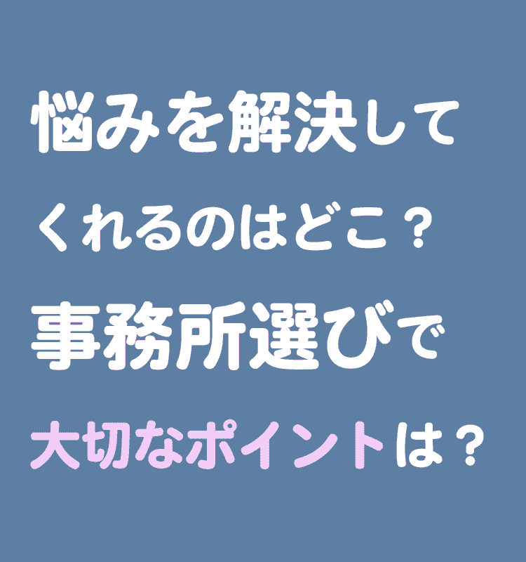 大切なポイントは、電話での対応や事務所訪問をした上で自分が抱えている不安が解消できる事務所を選ぶべきです。