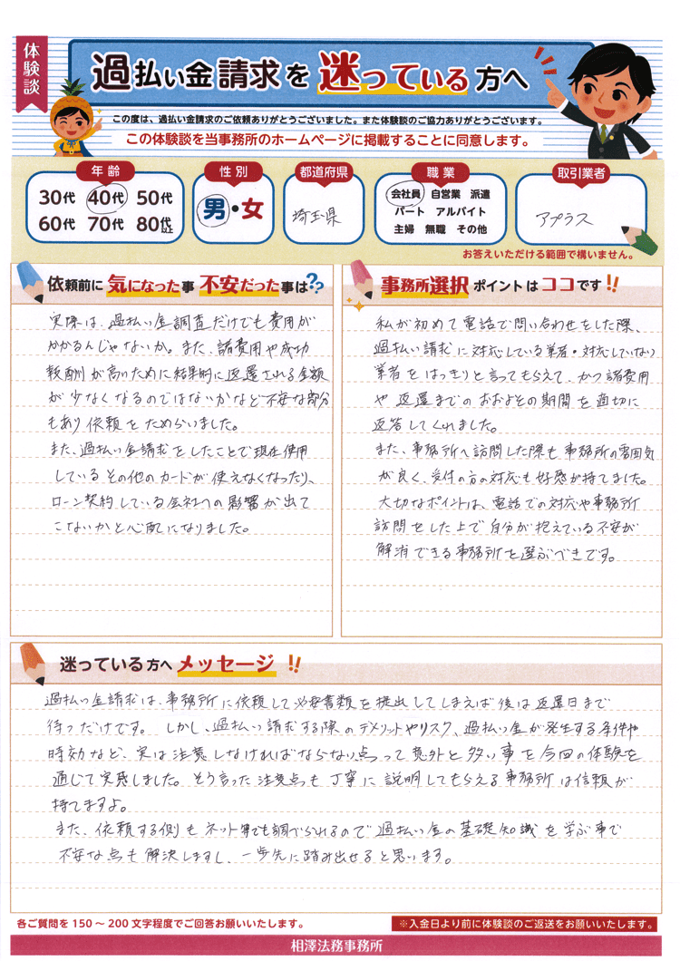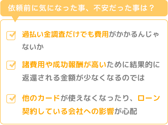 また、諸費用や成功報酬が高いために結果的に返還される金額が少なくなるのではないかなど不安な部分もあり依頼をためらいました。