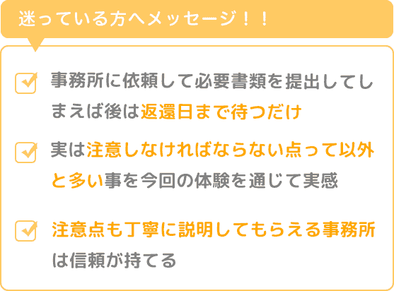 そう言った注意点も丁寧に説明してもらえる事務所は信頼が持てますよ。