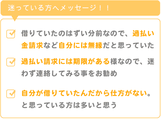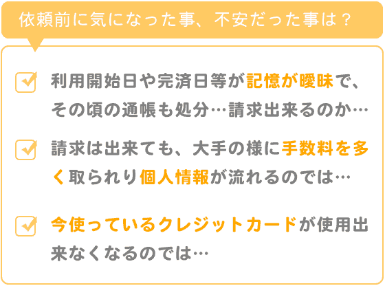 先ずカードを利用し始めたのが何年からで返済し終ったのがいつだったのかが定かでなく、又、その頃の通帳も処分してしまっていたので、請求出来るのか、不安でした。