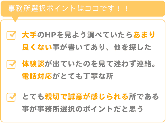 とても親切で誠意が感じられる所である事が事務所選択のポイントであると思います。